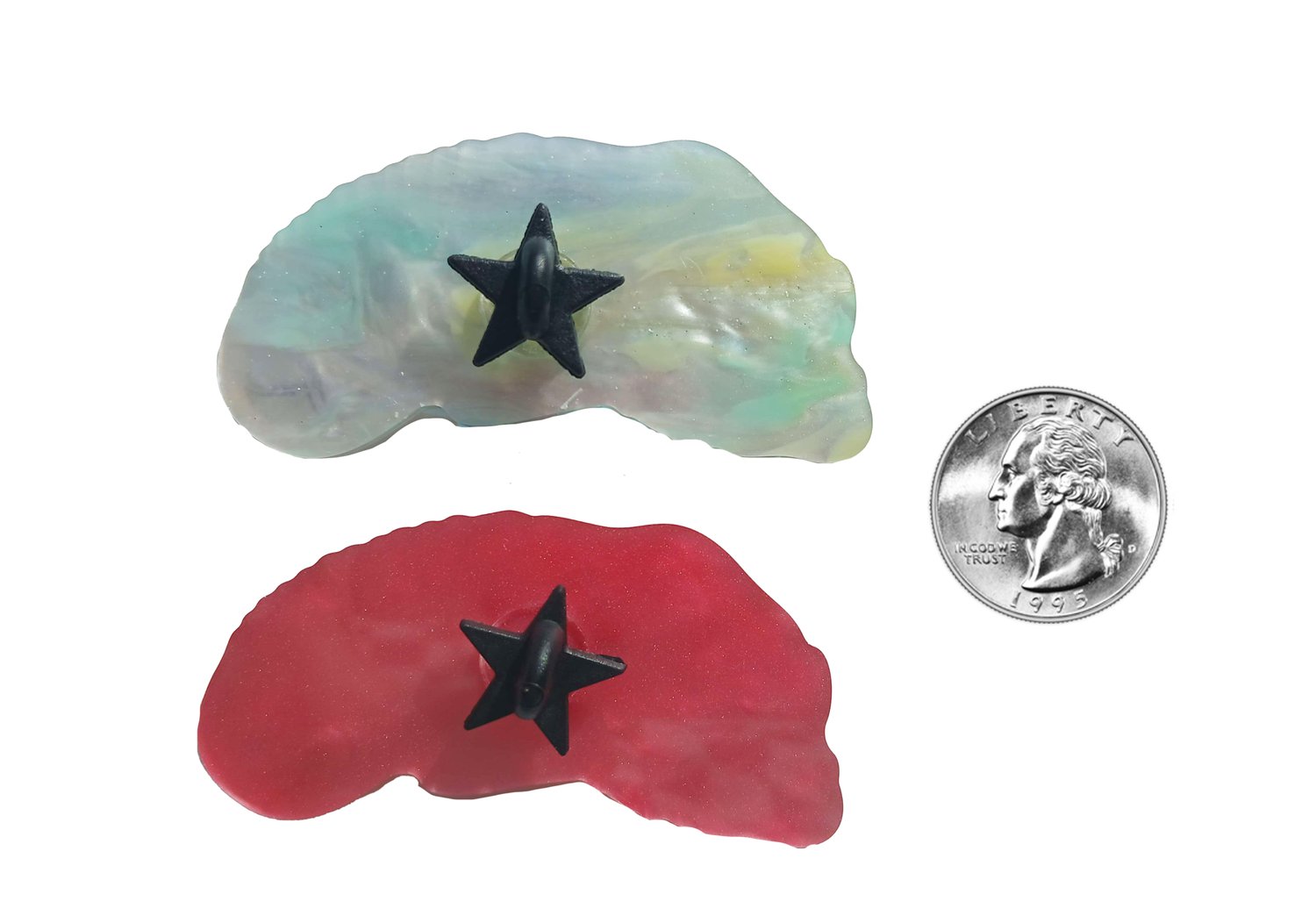 This is a pearl acrylic pin with a star shaped black rubber clutch. All of them have a slightly different background due to the material so they're all slightly different!